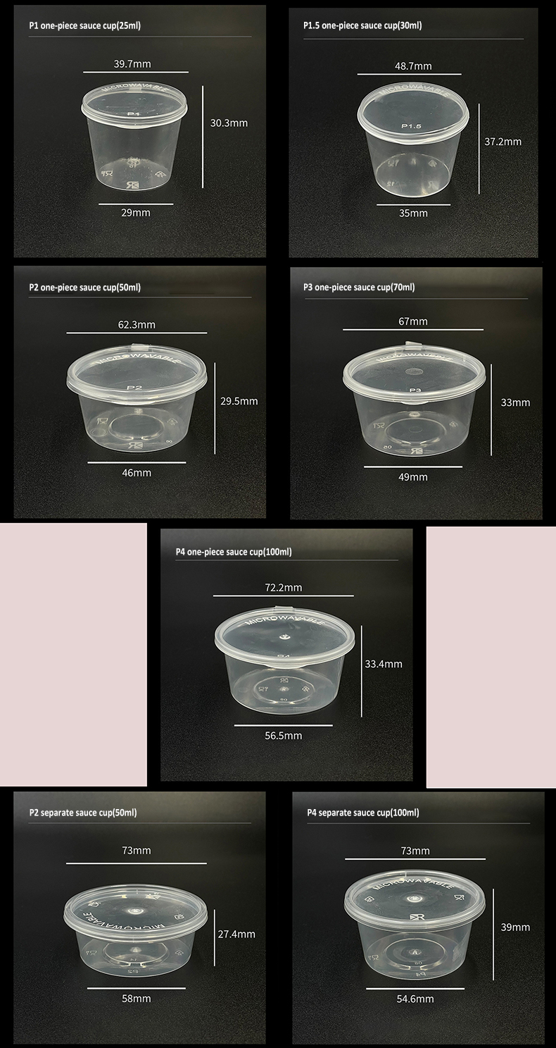 Our Disposable PP Sauce Cup is made of food-grade polypropylene material, offering capacities from 25ml to 100ml with two lid options: one-piece hinged lid and separate lid. The clear transparent design allows easy identification of contents, while the thickened material ensures durability and pressure resistance. The tight seal prevents leakage, making it perfect for holding sauces, dressings, dips, samples, and small portions of food. Safe for microwave heating, these cups are widely used in takeout restaurants, catering, food delivery, and daily kitchen use, providing a hygienic and convenient solution for portion control and food packaging.