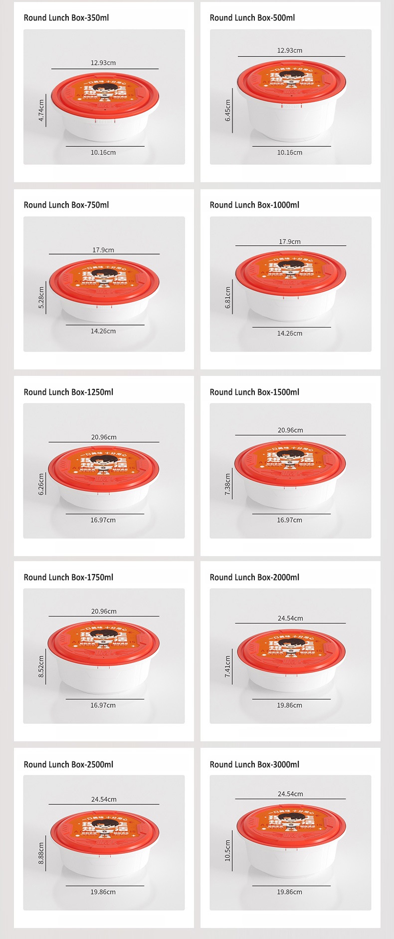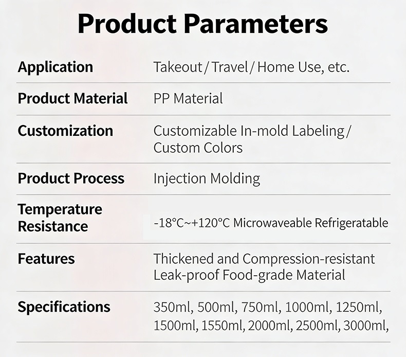 Our Disposable Round PP Lunch Box is made of food-grade polypropylene material, featuring a full range of capacities from 350ml to 3000ml to meet diverse packaging needs. Equipped with an anti-theft lock, sealed leak-proof structure, and venting hole design, it ensures food safety and freshness during delivery. The thickened, compression-resistant body and anti-stacking structure make storage and transportation more efficient. With temperature resistance from -18℃ to 120℃, it is safe for microwave heating and refrigeration. We also offer customizable in-mold labeling and color options to help businesses build brand identity. Perfect for takeout restaurants, food delivery, travel, and daily home use.