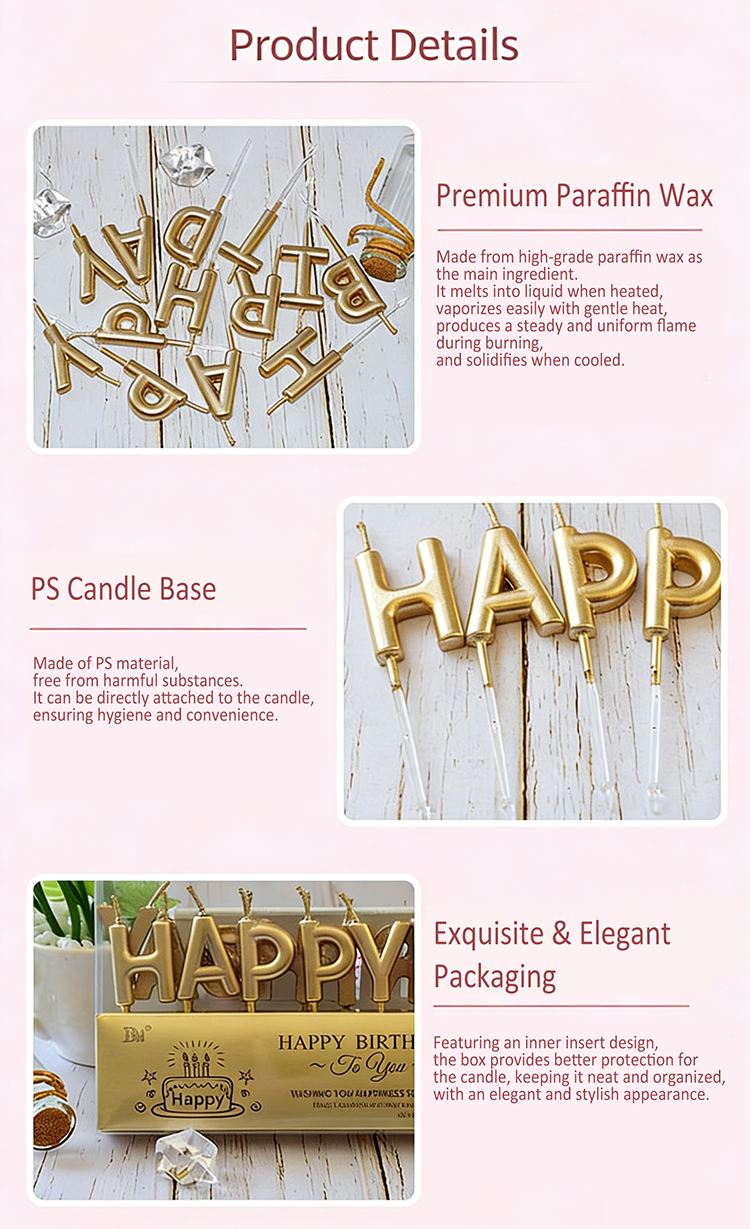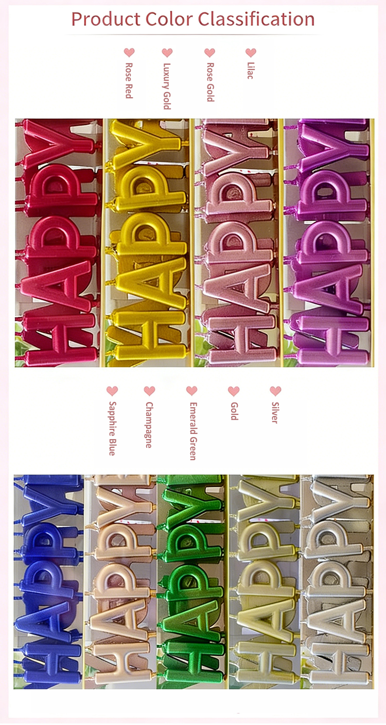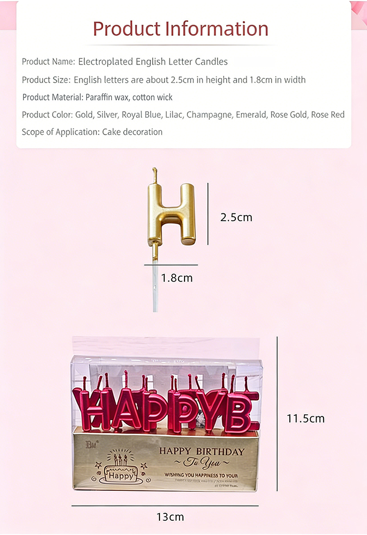 Our Electroplated "HAPPY BIRTHDAY" Letter Candles are designed to elevate your birthday cake decor. Crafted from high-grade paraffin wax with a cotton wick, each letter features a shiny metallic electroplated finish in 9 elegant colors (Gold, Silver, Royal Blue, Lilac, Champagne, Emerald Green, Rose Gold, Rose Red, Luxury Gold). The set spells out "HAPPY BIRTHDAY" and comes with a transparent PS plastic base for clean, mess-free insertion into cakes. The candles produce a steady, uniform flame while burning, and the exquisite packaging makes them an ideal gift or party supply for birthday celebrations.