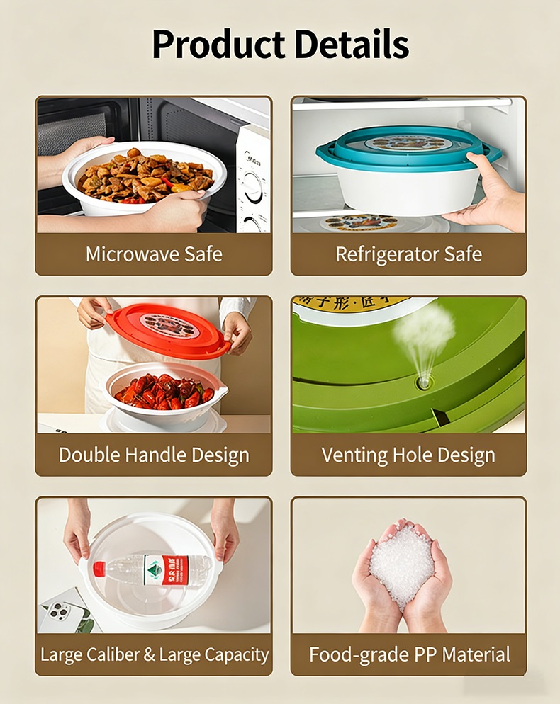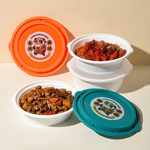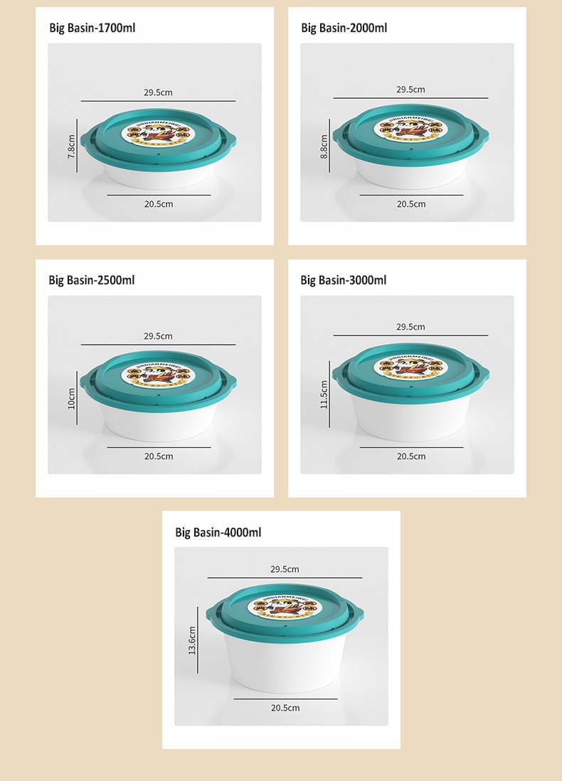 Our Disposable Large Round PP Food Basin is made of high-quality food-grade polypropylene material, available in 1700ml, 2000ml, 2500ml, 3000ml, and 4000ml capacities to meet large-capacity packaging needs. It features a double handle design for easy carrying, a venting hole to release steam during microwave heating, and a tight leak-proof seal to prevent soup and oil leakage. Safe for microwave heating and refrigeration, this basin comes in multiple color options (teal, green, orange, red, transparent) and supports custom branding. Perfect for family-style meals, takeout, catering, hot pot, and group dining, it offers a hygienic and convenient solution for large-volume food packaging.